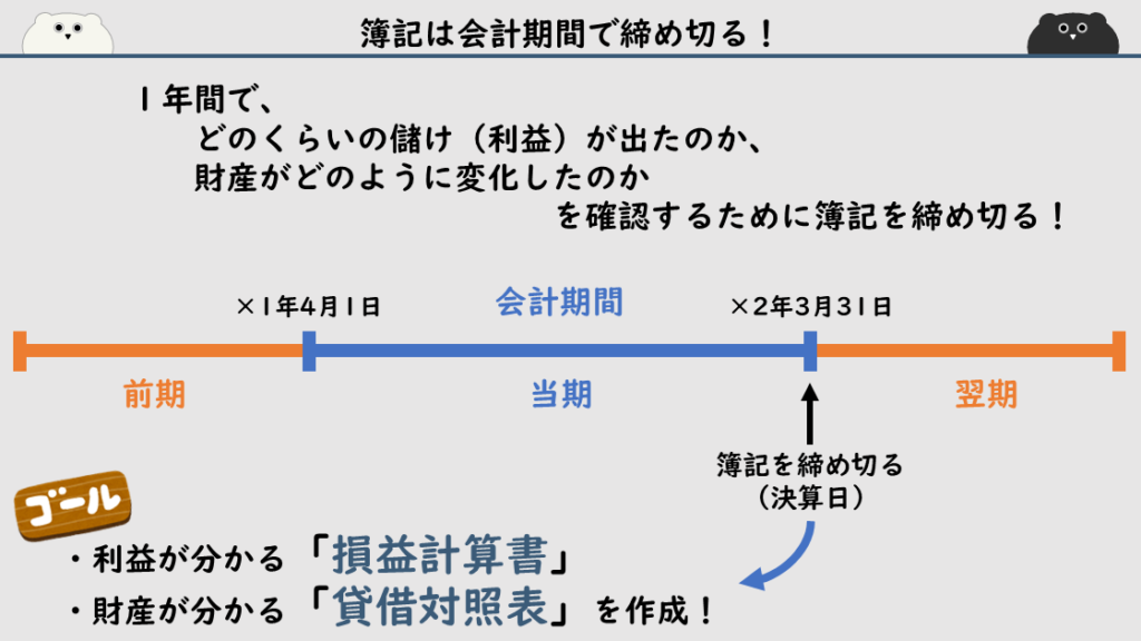 簿記で付けた取引記録は、×2年3月31日に締め切る、ということになります。