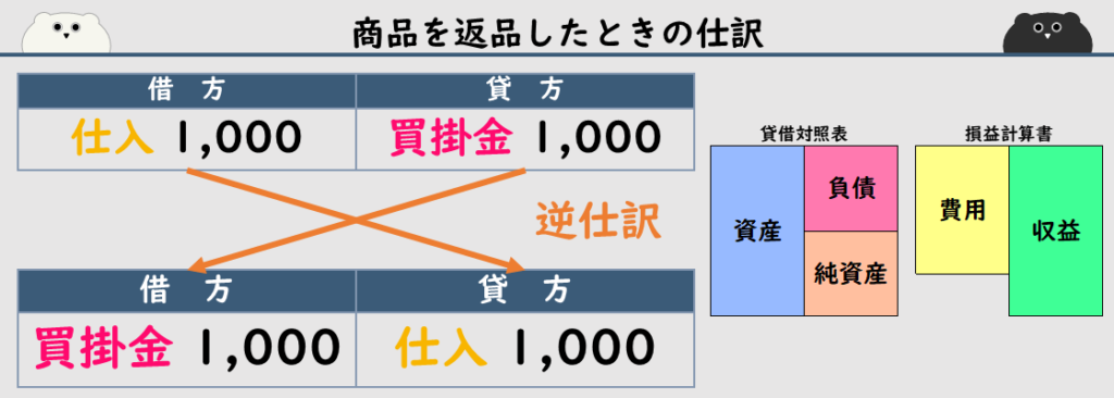 そして、返品の仕訳は、仕入れたときの仕訳を取り消すために逆仕訳をします。