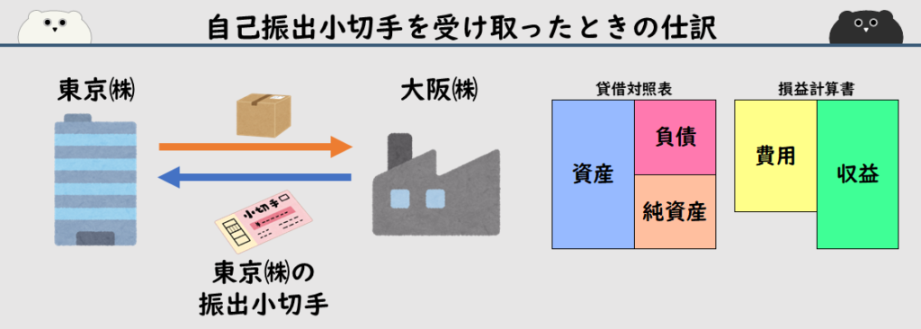 この記事の内容は自己振出小切手を受け取ったときの仕訳方法となります。