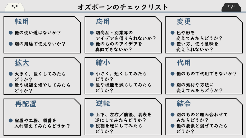 に活用できる「オズボーンのチェックリスト」について、具体例を挙げながら分かりやすく解説しています。